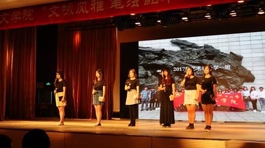 金风送爽,雁过留声。值此秋意深浓之时,为热烈欢迎2017级新生们的到来,增强学院凝聚力、创造力,文学院于2017年11月11日15:00在新大学活动中心隆重举行“文咏风雅,笔绘韶华”2017级迎新文艺汇演。秉承我院“一口妙语,一笔好字,一手美文,一身儒雅”(“四个一”)的院训,迎新汇演特选于11月11日举行。
